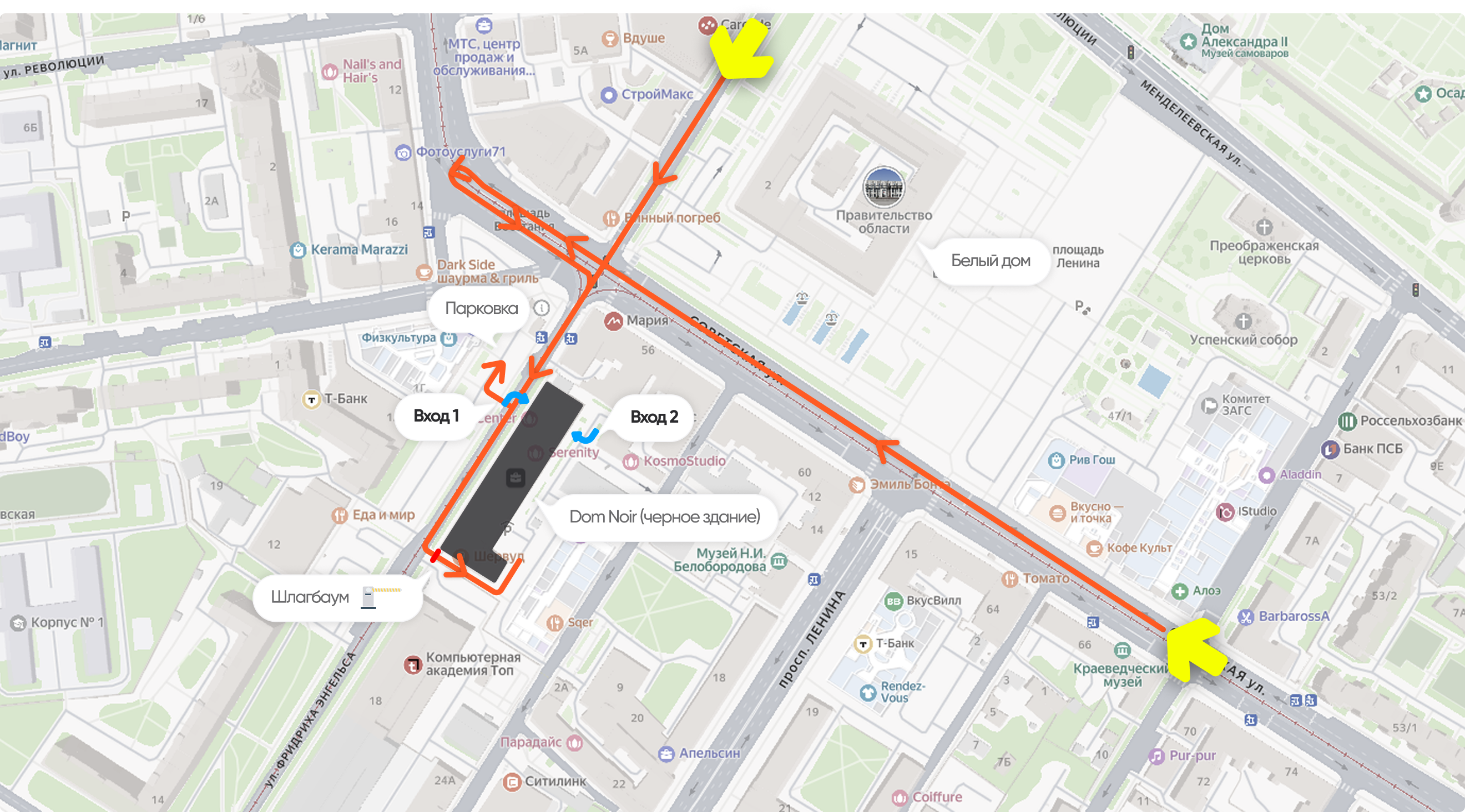 Чтобы припарковаться за шлагбаумом на парковке здания Dom Noir следуйте инструкции на въезде около шлагбаума. Либо вы можете запарковаться на платной парковке через дорогу от здания